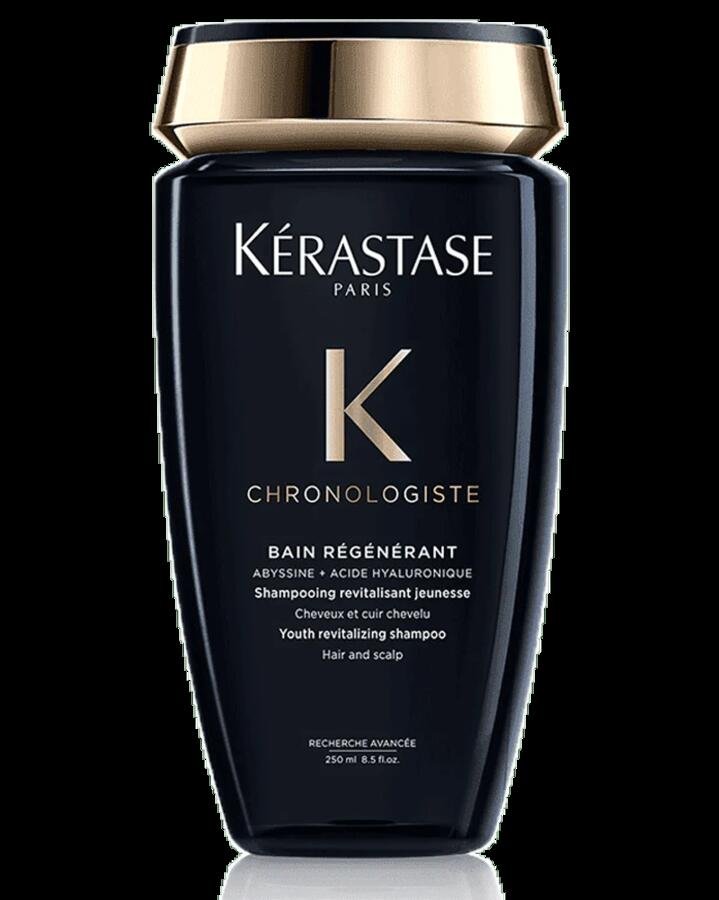 Experience the pinnacle of hair revitalisation with Kérastase Chronologiste Bain Régénérant, a luxurious, youth-revitalising shampoo for all hair types. This is the essential first step in the Chronologiste routine, designed to gently cleanse impurities from the scalp and hair fibre while delivering exceptional, long-lasting hydration. Powered by a potent combination of Hyaluronic Acid, Abyssine, and Vitamin E, it works to invigorate the hair, restore shine, and protect against environmental aggressors. Infused with the signature Chronologiste fragrance of Tea Rose, Woods, and Musk, this shampoo leaves hair feeling incredibly soft and supple with a renewed vitality.