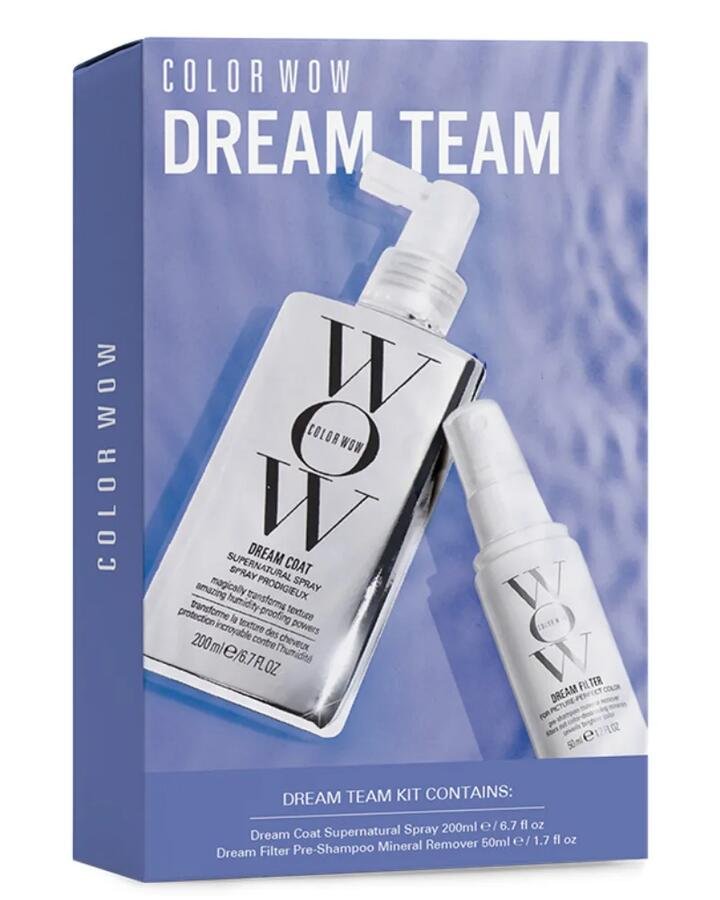 Achieve your ultimate dream hair with the Color Wow Dream Team Pack. This essential duo is your secret weapon against the two biggest culprits that dull your colour and ruin your style: frizz-causing humidity and colour-distorting minerals found in tap water. The pack features the iconic Dream Coat Supernatural Spray to provide powerful humidity-proofing for a sleek, ‘glass hair’ finish, alongside the award-winning Dream Filter Pre-Shampoo Mineral Remover to gently lift away dulling mineral buildup. Together, they create the perfect foundation for vibrant, healthy-looking, and flawlessly smooth hair.
