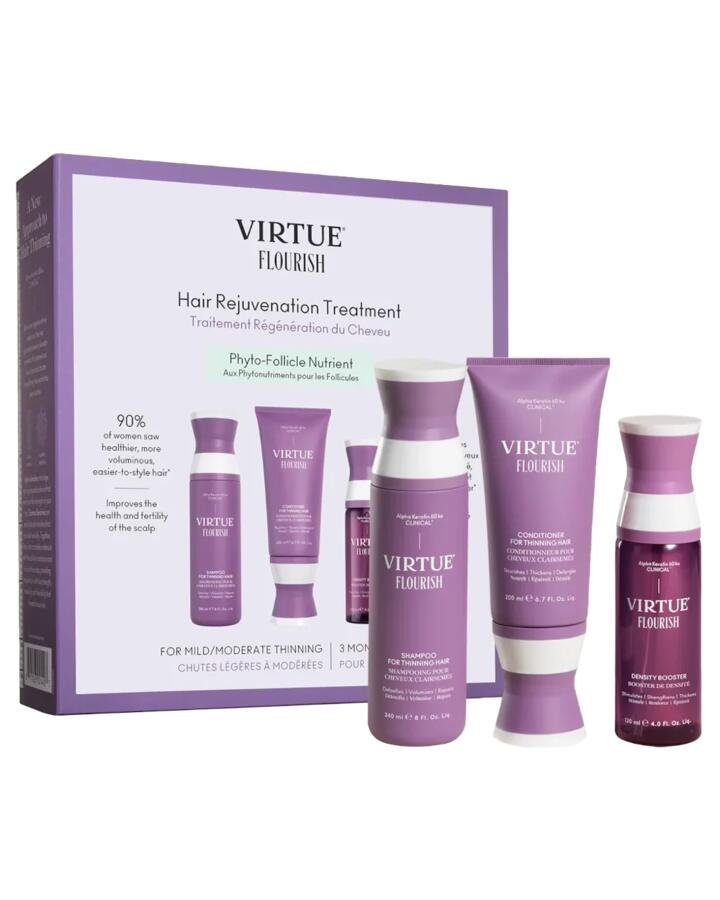 Support your hair’s comeback story with the Virtue Flourish Hair Rejuvenation Treatment Kit—a complete regimen designed to cleanse, nourish, and stimulate thinning hair. This trio includes full sizes of the Flourish Shampoo, Conditioner, and Density Booster, each powered by Alpha Keratin 60ku® Clinical to strengthen fragile strands and fuel new growth. Ideal for mild to moderate thinning, postpartum shedding, or anyone seeking fuller, healthier hair.