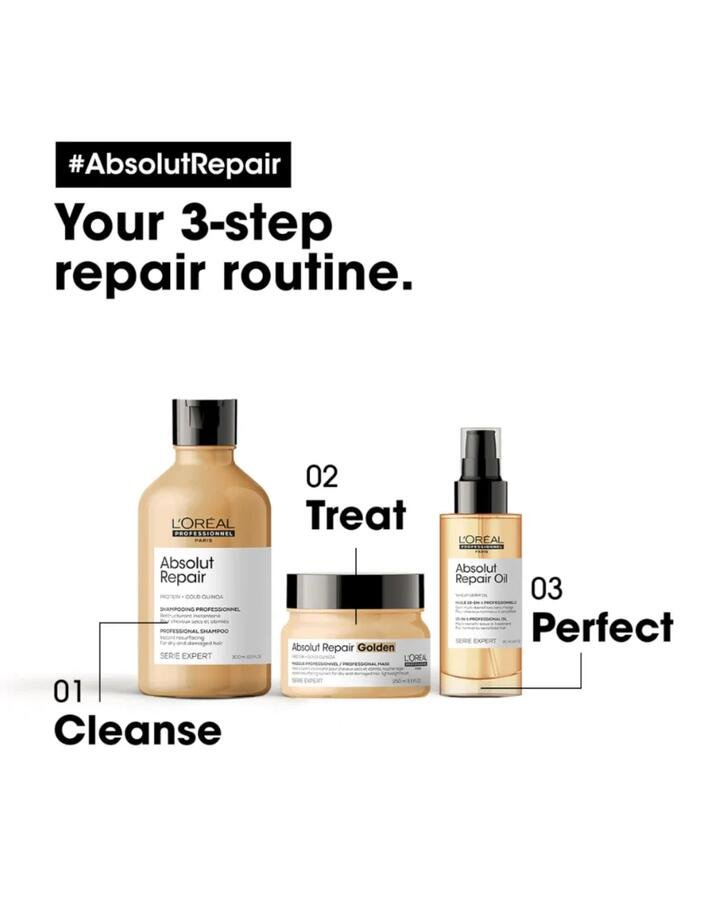 Revitalize and repair damaged hair using L’Oreal Professionnel Serie Expert Absolut Repair Gold Quinoa & Protein Golden Masque Lightweight. This rejuvenating mask is enriched with a cream-in-gel formula that enhances hair with a shiny, smooth, and nourished finish.