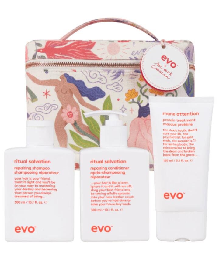 Give the gift of repaired, stronger hair with the limited-edition evo wonderlocks repair gift set. This is the ultimate intervention for weak, brittle, and chemically-treated hair. This powerful trio works together to cleanse, condition, and provide an intensive protein treatment to rebuild the hair from the inside out. The set includes the Ritual Salvation Repairing Shampoo and Conditioner to gently cleanse and strengthen, plus the Mane Attention Protein Treatment for a powerful weekly dose of repair. The result is hair that is left stronger, softer, and more resilient against breakage.