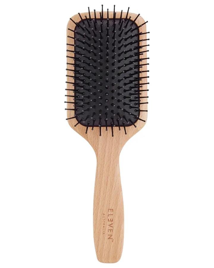 The ELEVEN Australia Wooden Paddle Brush is a professional-quality, everyday styling tool designed to smooth, detangle, and blow-dry all hair types with ease. Crafted from natural beech wood, this brush features a wide, cushioned base and flexible, heat-resistant nylon bristles that glide effortlessly through the hair, reducing breakage, frizz, and static.